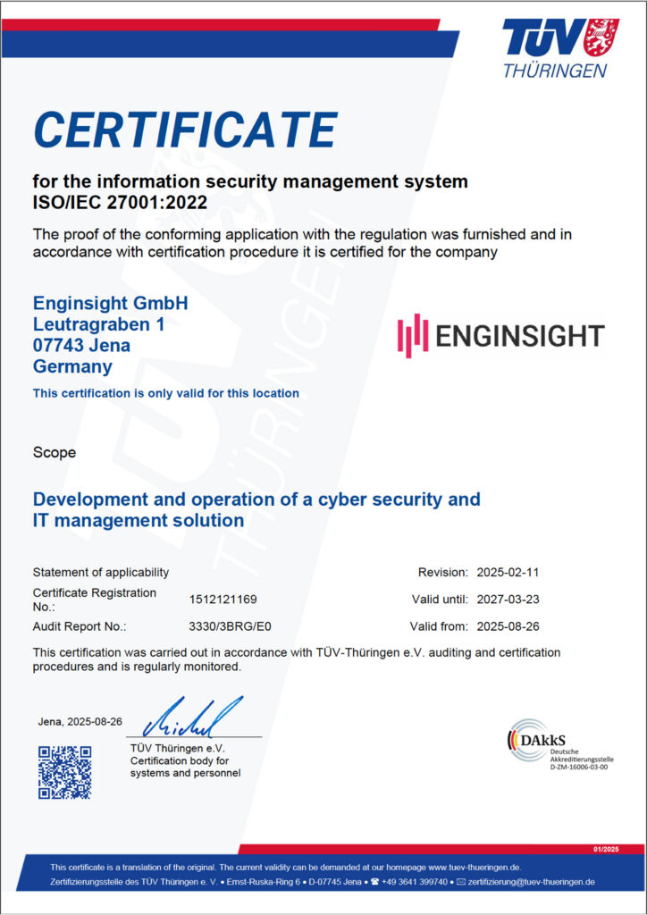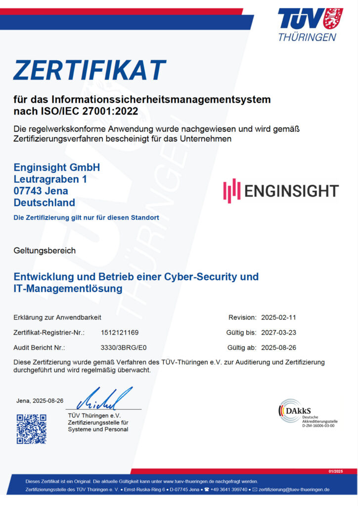 Als IT-Security-Softwarehersteller ist es für uns selbstverständlich, dass wir höchste Maßstäbe an unser Qualitäts- und Informationssicherheitsmanagement legen. Der TÜV Thüringen hat uns die regelwerkskonforme Anwendung der ISO-Normen 27001 und 9001 in einem Zertifizierungsverfahren bescheinigt. Durch die Zertifizierung ist Enginsight bestens gerüstet für internationale Kooperationen in sicherheitssensitiven Branchen, beispielsweise mit KRITIS-Betreibern.